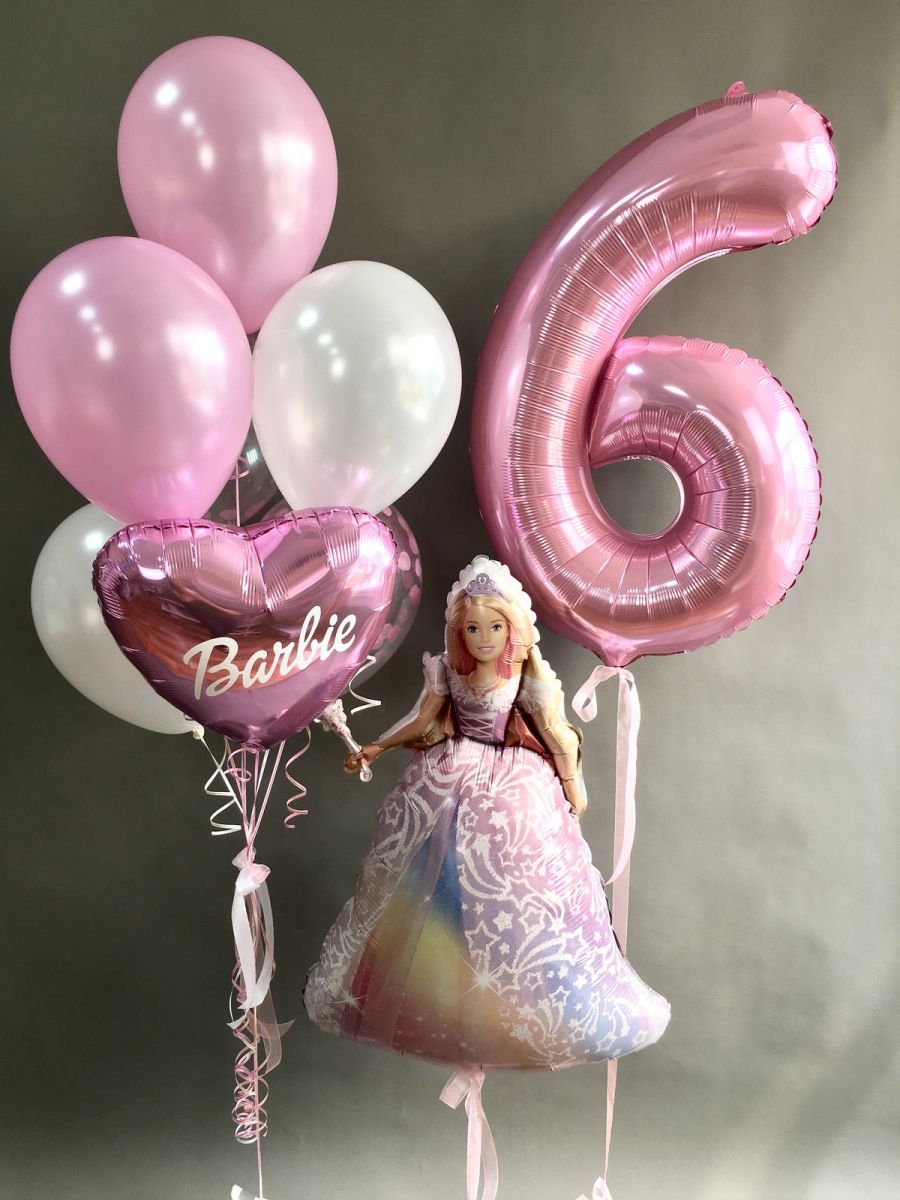Праздничный букет из фольгированных шаров «Барби» раскрасит день рождения любой девочки нежными красками. Композиция состоит из 8 латексных шаров 1 шар с надписью фигура1шт и цифра
