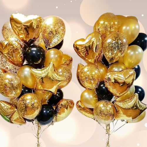 Золотые шары, черные шары, шары-звезды.