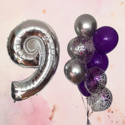 Фиолетовые шары, серебряные шары, шар-цифра 9.